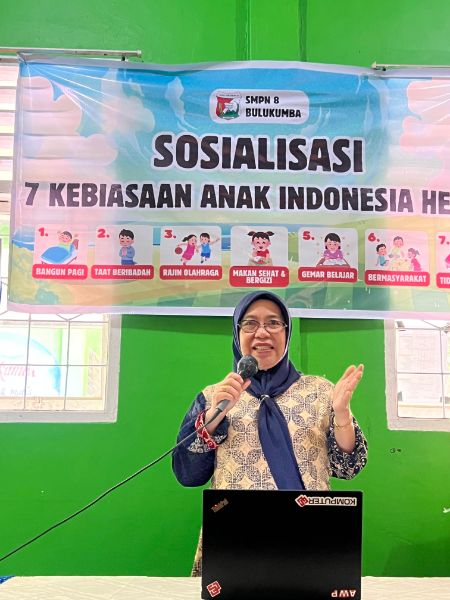 SimpulNusantara.com_BULUKUMBA, Dalam upaya menanamkan karakter positif pada peserta didik, SMPN 8 Bulukumba menggelar Sosialisasi Gerakan 7 Kebiasaan Anak Indonesia Hebat Berbasis Digital, Kamis 9 Oktober 2025. Kegiatan ini dipimpin langsung oleh Kepala SMPN 8 Bulukumba, Andi Nurwina Pangki, dan diikuti oleh guru serta perwakilan siswa di aula sekolah.