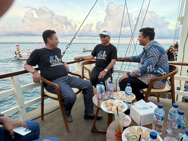 Di atas kapal pinisi simbol kejayaan dan warisan budaya maritim masyarakat Bulukumba para tokoh tampak menikmati keindahan laut sembari berbincang santai. Rombongan berlayar mengelilingi kawasan pesisir Pantai Merpati dalam suasana penuh keakraban dan kekeluargaan.