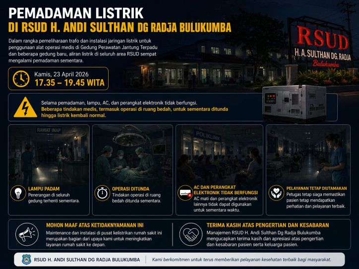 Atas ketidaknyamanan yang ditimbulkan, manajemen RSUD H. Andi Sulthan Dg Radja Bulukumba menyampaikan permohonan maaf kepada seluruh pasien dan keluarga pasien. Pemeliharaan serta peningkatan sistem kelistrikan ini merupakan bagian dari upaya peningkatan kualitas layanan kesehatan rumah sakit.