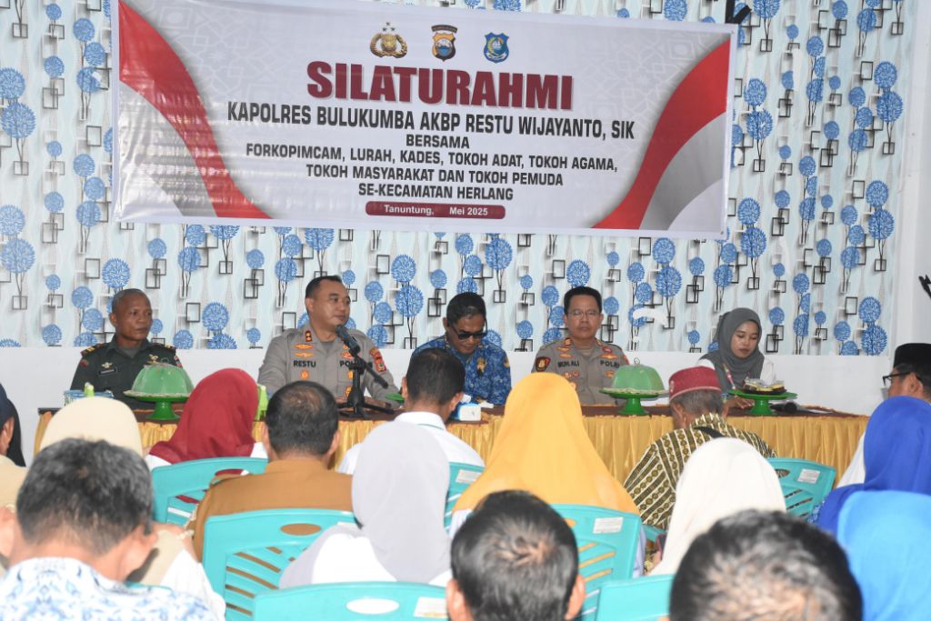SimpulNusantara.com_BULUKUMBA, Kapolres Bulukumba, AKBP Restu Wijayanto, S.I.K., menggelar kegiatan silaturahmi bersama Forkopimca, para lurah dan kepala Desa, tokoh adat, tokoh agama, tokoh masyarakat, serta tokoh pemuda se-Kecamatan Herlang. Kegiatan ini berlangsung di Aula Kantor Camat Herlang, Selasa (20/5/2025).